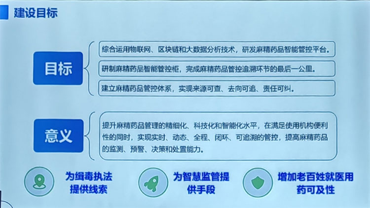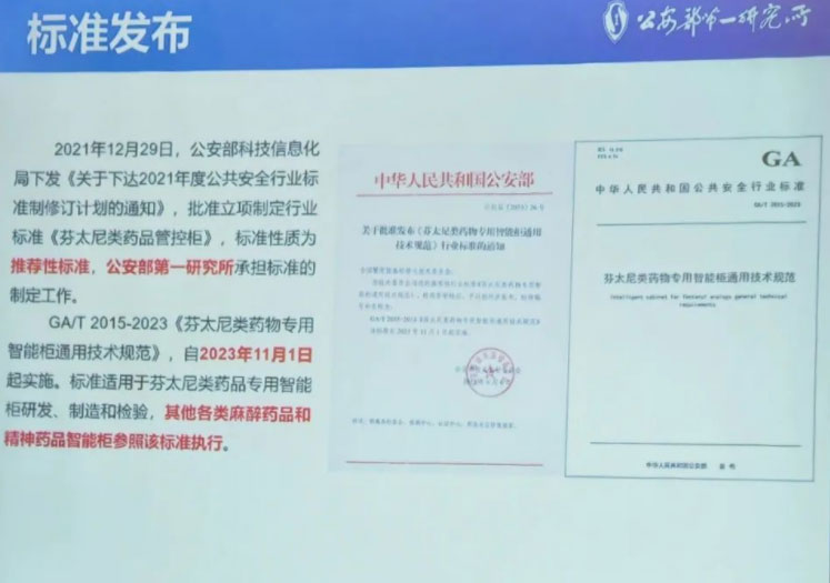 会议上,公安部第一研究所全面介绍麻精药品滥用的危害、监管面临和存在的问题以及相关国家政策要求,制定了《芬太尼类药物管控柜》行业标准并颁布实施,我司依照标准升级本公司产品智能化,并通过公安部信息化安全传输认证。